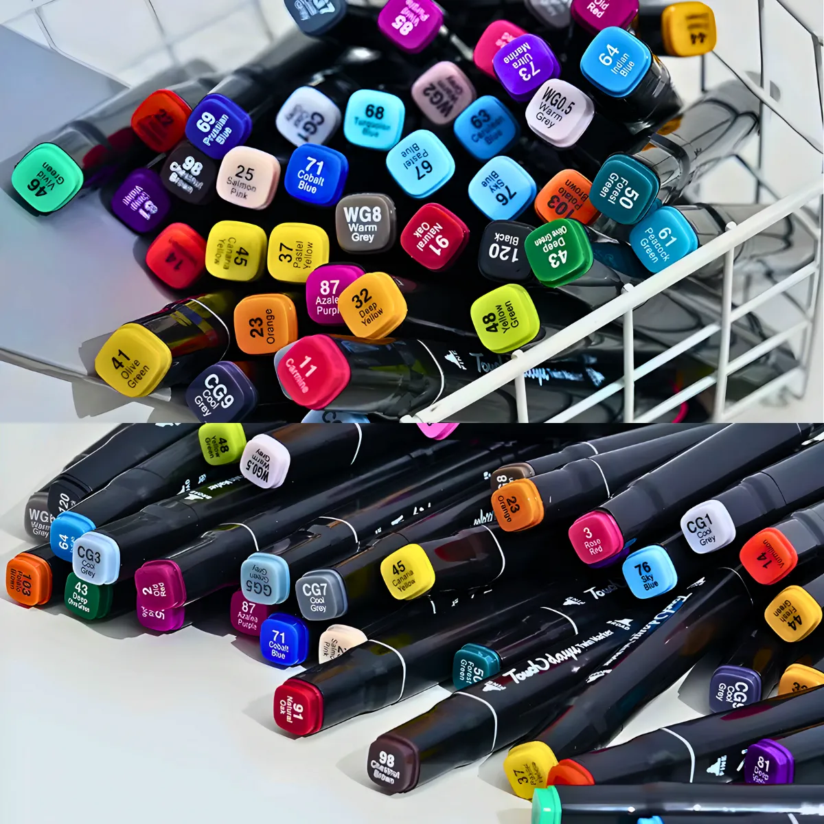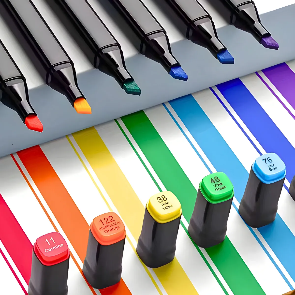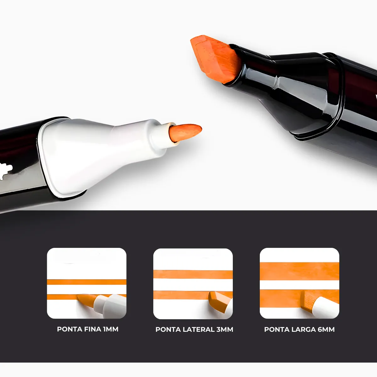– Pontas Duplas : Cada caneta possui duas pontas: uma ponta fina para detalhes e linhas finas, e uma ponta de pincel, ideal para traços largos, sombreamento e preenchimento. A versatilidade das pontas garante máxima flexibilidade.