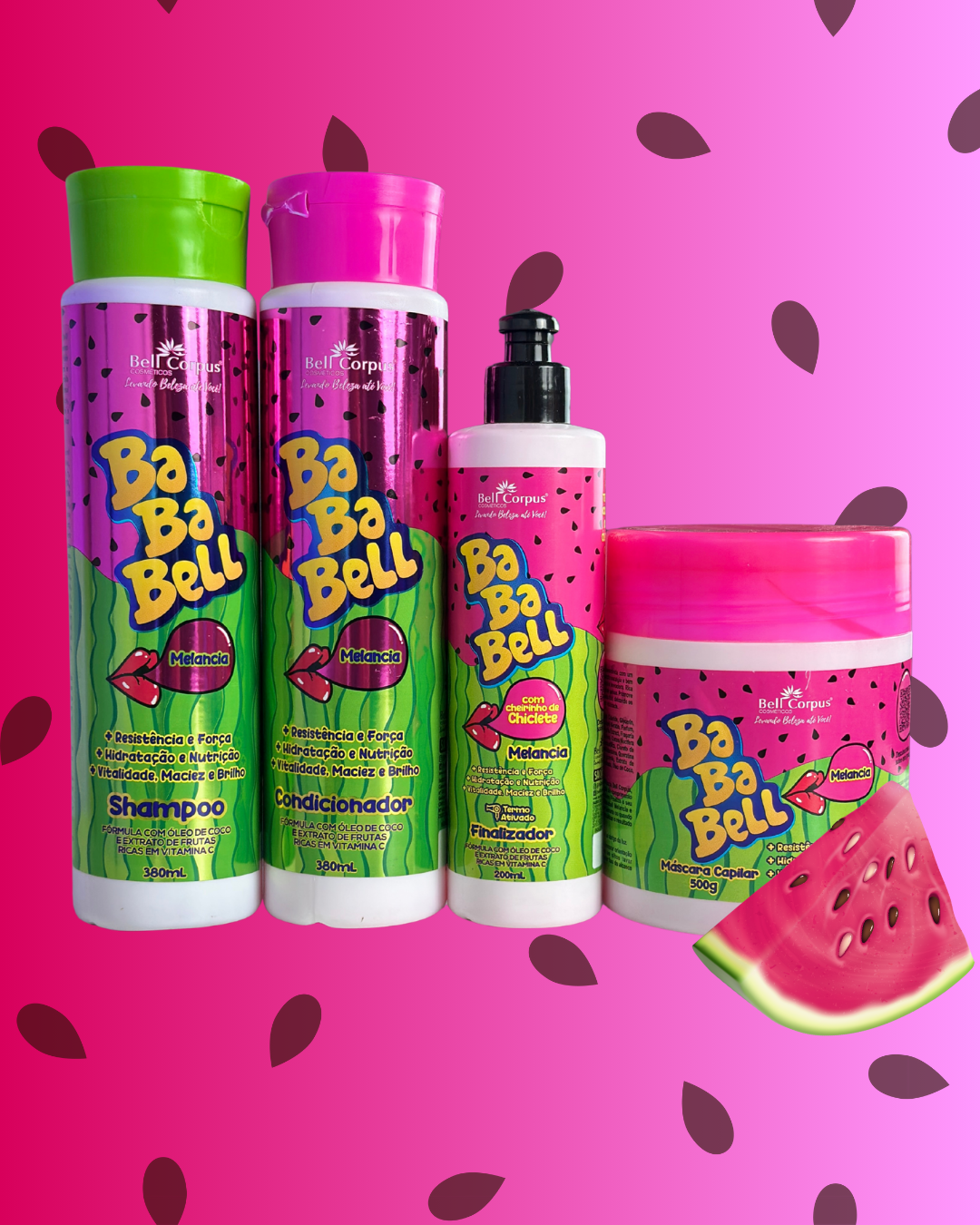 O Kit Capilar BabaBell Cheiro de Babalu Melancia traz um tratamento completo para os cabelos com uma fragrância deliciosa que lembra o famoso chiclete da infância. Além de cuidar dos fios, transforma sua rotina capilar em uma experiência divertida, perfumada e eficaz.