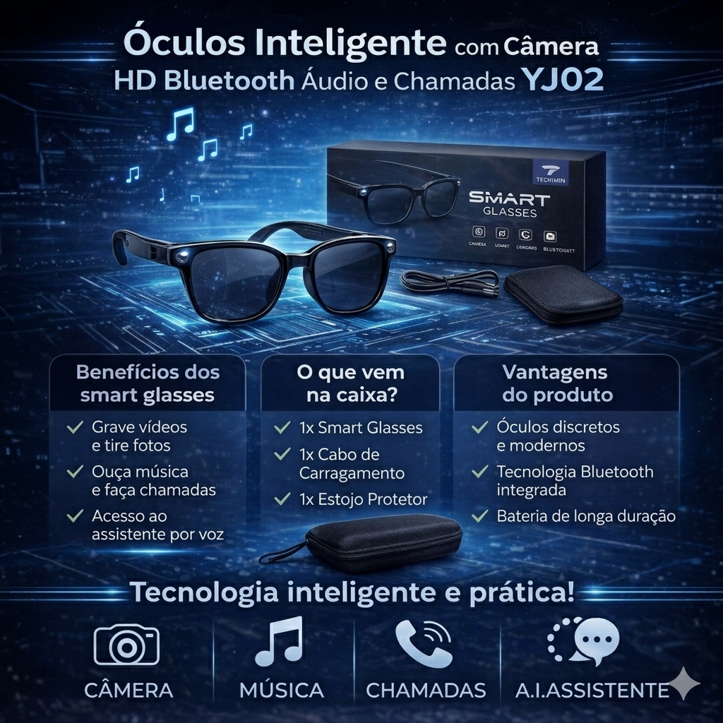 Os Óculos Inteligentes YJ02 unem tecnologia, praticidade e estilo em um único produto. Com câmera HD integrada, conexão Bluetooth e função de chamadas, permitem que você grave vídeos, ouça músicas e atenda ligações sem precisar usar as mãos. Ideal para o dia a dia, trabalho, viagens e atividades ao ar livre.